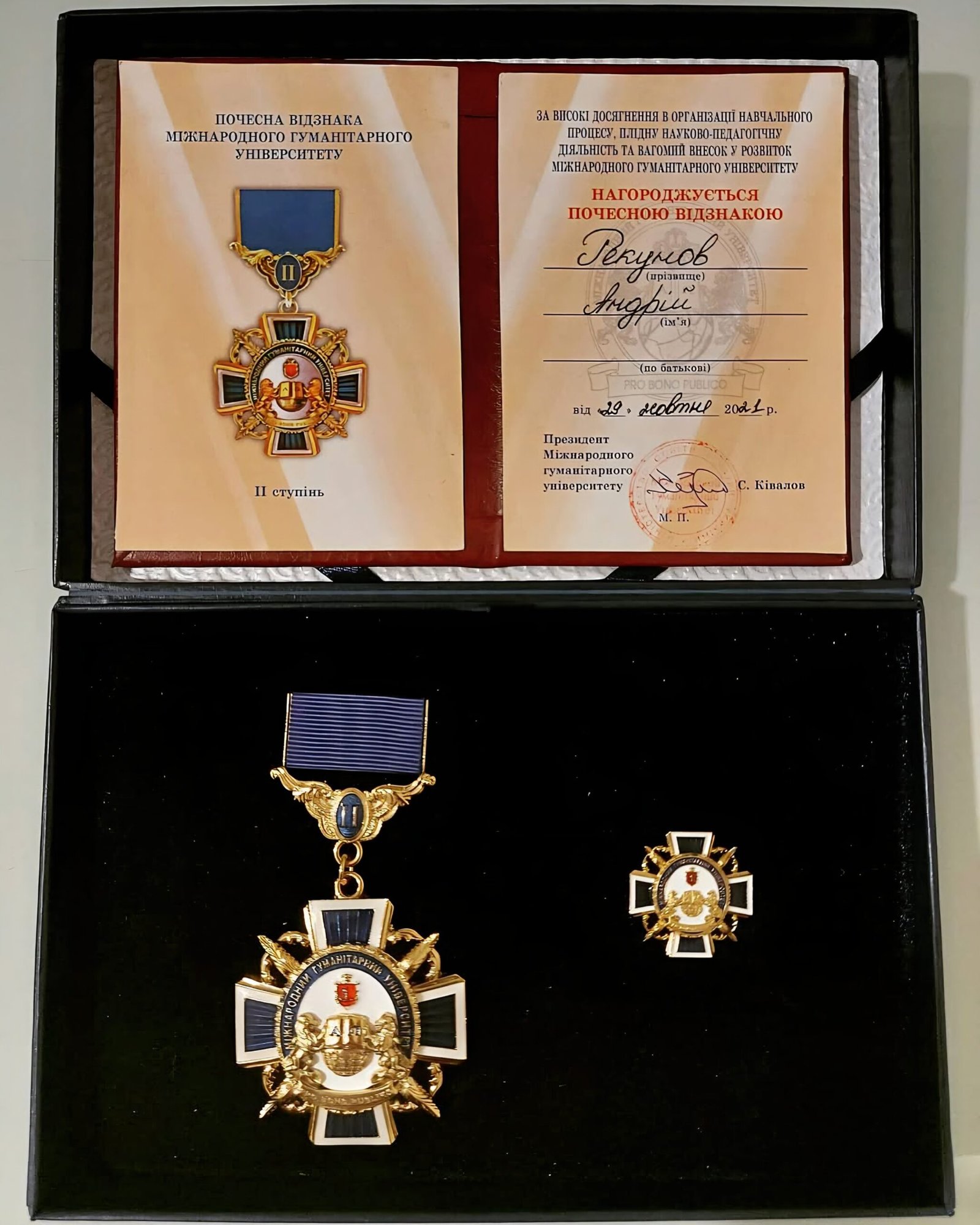 “Awarded the Honorary Order of the 2nd Degree for outstanding achievements in organizing the educational process, fruitful scientific and pedagogical activities, and significant contributions to the development of the International Humanitarian University.